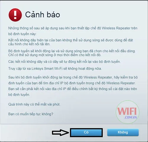 Một mục cảnh báo sẽ hiện ra, thông báo rằng thiết bị sẽ chuyển sang chế độ Repeater và có thể làm thay đổi các thiết lập mạng khác. Bạn nhấn “Có” (Yes) để xác nhận quyết định này. Thiết bị Linksys sẽ tiến hành tự khởi động lại. Nó sẽ quét và kết nối với mạng Wi-Fi gốc, sau đó bắt đầu phát lại sóng. Quá trình này có thể mất vài phút để hoàn thành.