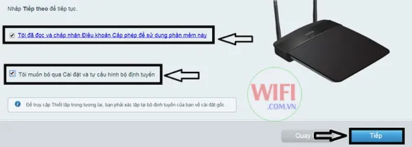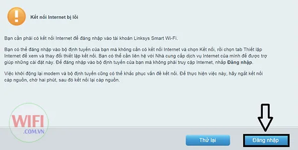 Trong trường hợp bạn chưa cắm dây mạng từ modem chính (Internet) vào cổng WAN của Linksys, một thông báo có thể hiện ra. Bạn không cần lo lắng về điều này. Chỉ cần chọn mục “Đăng nhập” hoặc “Tiếp tục” để bỏ qua thông báo và truy cập vào trang quản lý nội bộ.