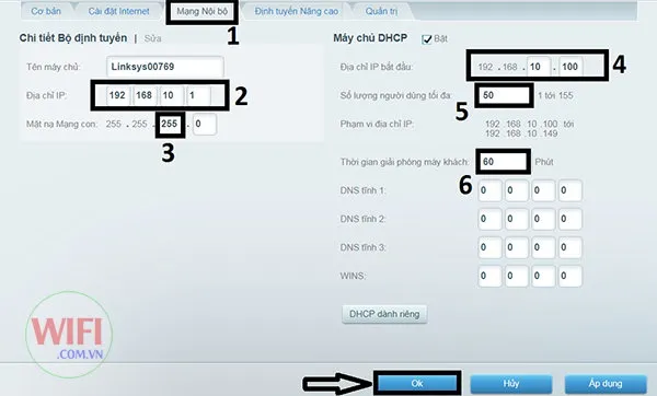 Số lượng IP Cấp: Bạn xác định tổng số địa chỉ IP tối đa mà Linksys có thể cấp. Đặt giá trị hợp lý (ví dụ: 100 hoặc 150) để tránh lãng phí.