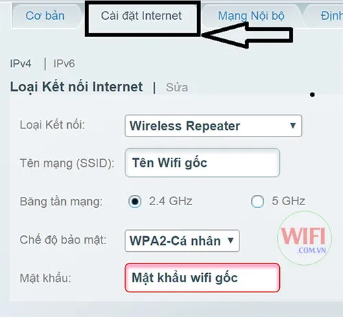 - Kiểm tra Chính xác: Quay lại mục Cài đặt Internet và kiểm tra lại Tên mạng, Chế độ bảo mật, và Mật khẩu của Wi-Fi gốc một lần nữa. Mọi sai sót về chữ hoa, chữ thường đều không được chấp nhận.
