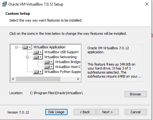 Màn hình tùy chọn sẽ cho phép bạn chọn các thành phần. “VirtualBox Application” là bắt buộc. “USB Support” và “Network” cũng nên được giữ nguyên. Chúng là các tính năng thiết yếu cho máy ảo.