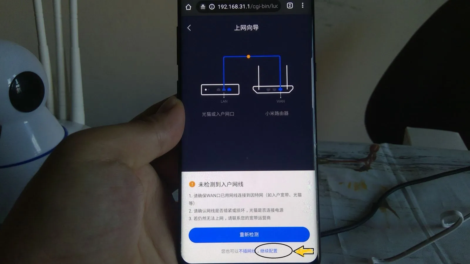 Giữ nguyên kết nối với Wi-Fi của Mi4C. Mở trình duyệt web trên điện thoại và nhập địa chỉ 192.168.31.1 vào thanh URL. Đây là địa chỉ IP mặc định để truy cập giao diện cấu hình của Mi4C. Trên màn hình đầu tiên, bạn hãy bỏ dấu tích ở ô dưới cùng. Sau đó, nhấn vào nút xác nhận để tiếp tục.