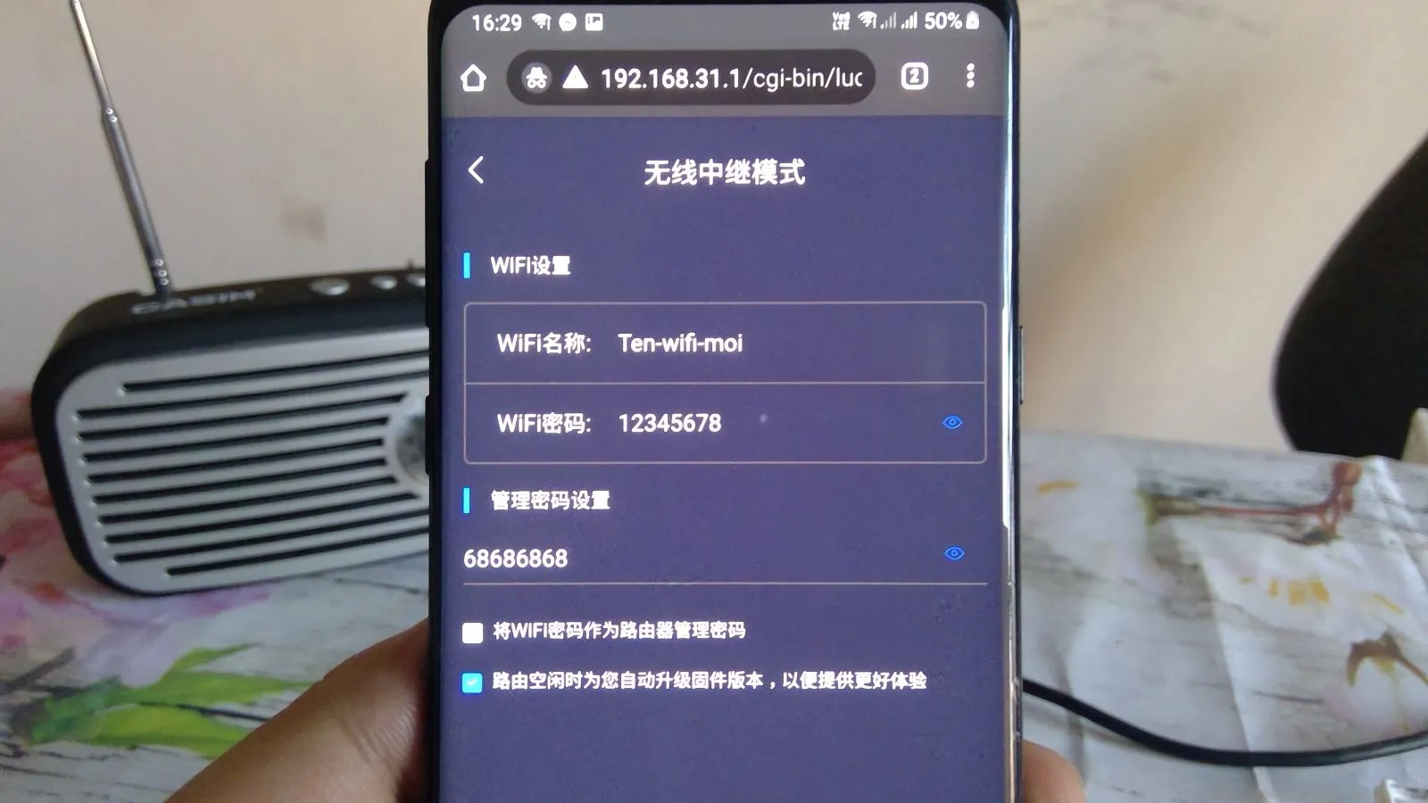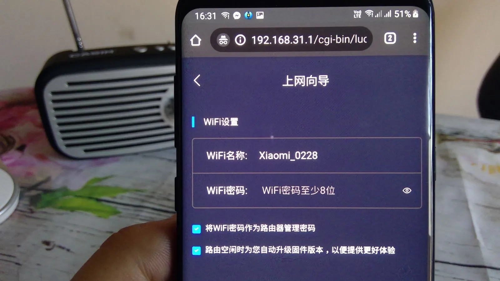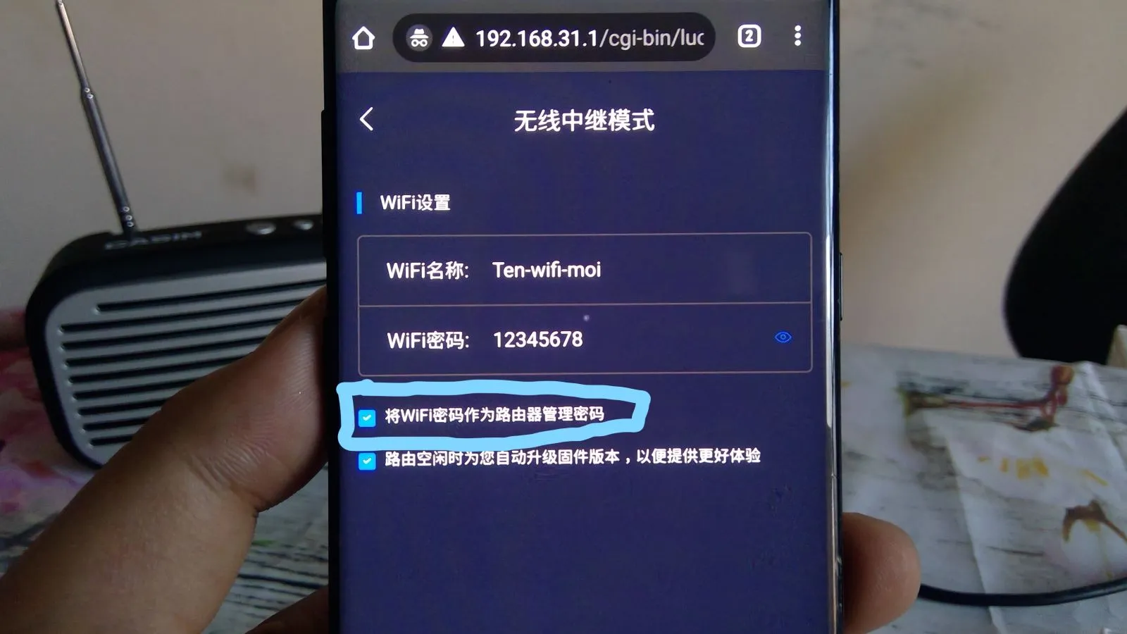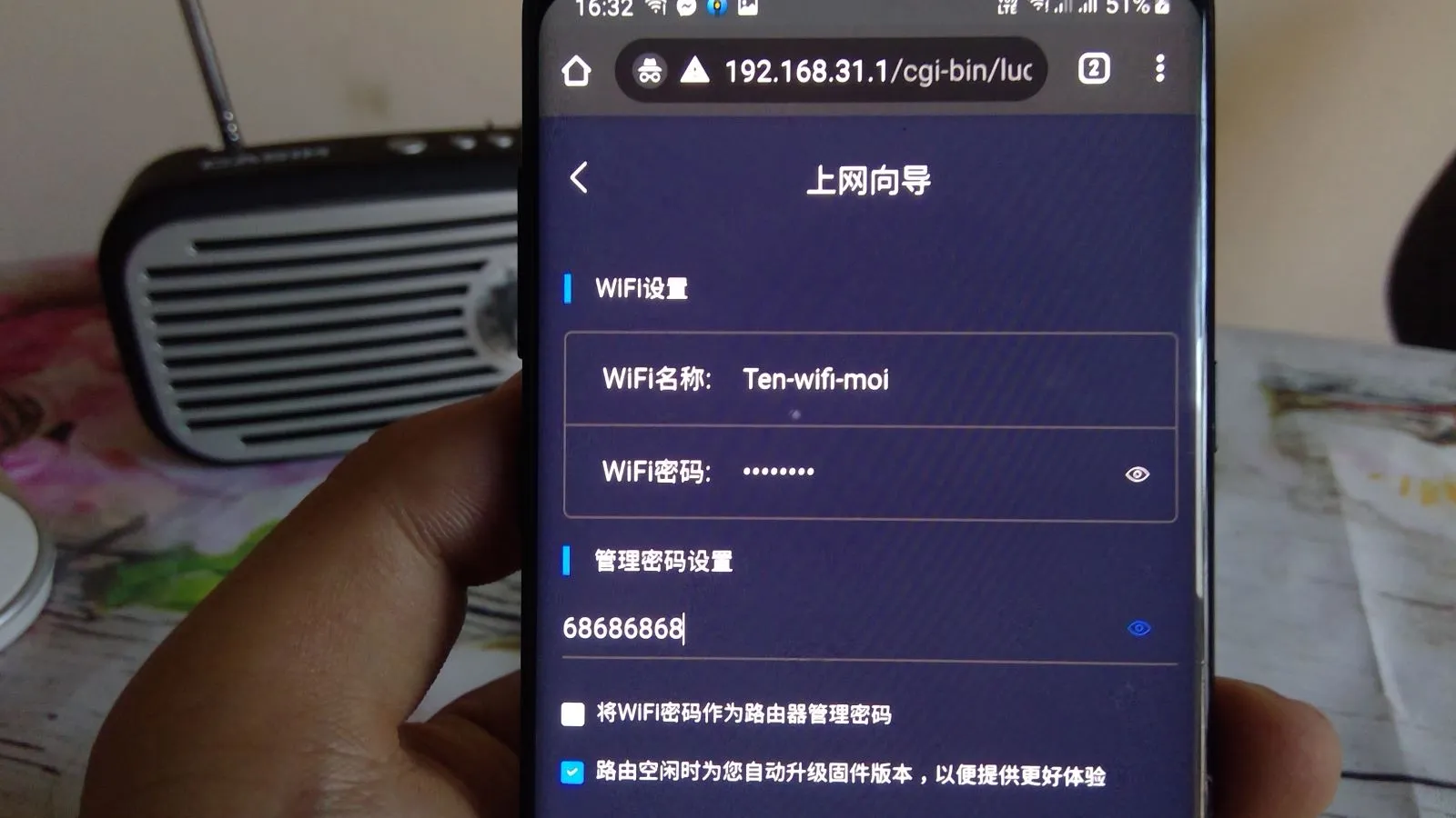 Tiếp theo là phần đặt tên (SSID) và mật khẩu cho mạng Wi-Fi mới do Mi4C phát ra. Bạn có thể chọn tên và mật khẩu giống hoặc khác với mạng chủ. Quan trọng là bạn cần bỏ dấu tích màu xanh ở phần Wi-Fi, tùy chọn này cho phép bạn đặt mật khẩu quản lý thiết bị. Mật khẩu này dùng để truy cập vào giao diện 192.168.31.1 sau này. Mật khẩu này phải có ít nhất 8 ký tự và không liên quan đến mật khẩu Wi-Fi.