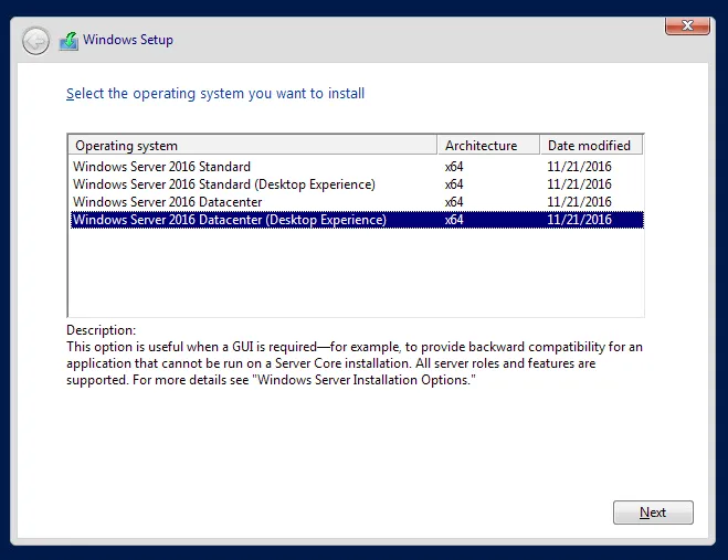 Microsoft cung cấp hai loại hình cài đặt chính cho Windows Server 2016. Tùy chọn mặc định là Windows Server 2016 Standard không có giao diện đồ họa (GUI), còn được gọi là Server Core. Đây là phiên bản chỉ sử dụng giao diện dòng lệnh PowerShell, tối ưu hóa tài nguyên và tăng cường bảo mật.