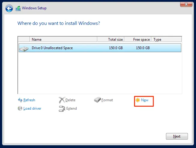 Đây là bước quản lý không gian lưu trữ trên ổ đĩa ảo đã tạo trước đó trong VMware. Nếu ổ đĩa được hiển thị là Unallocated Space, bạn cần nhấp vào New để tạo phân vùng mới. Hệ điều hành sẽ tự động tạo các phân vùng cần thiết (phân vùng System Reserved, Recovery) ngoài phân vùng chính C:.