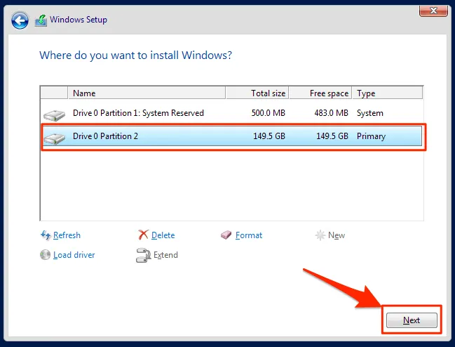 Nếu bạn đang cài đặt lại, hãy chọn phân vùng cài đặt cũ và nhấp vào Format để xóa sạch dữ liệu. Sau khi chia hoặc định dạng phân vùng, hãy chọn phân vùng muốn cài đặt và nhấp Next. Đảm bảo phân vùng này có ít nhất 60 GB dung lượng để tránh các vấn đề về cập nhật hệ thống sau này.
