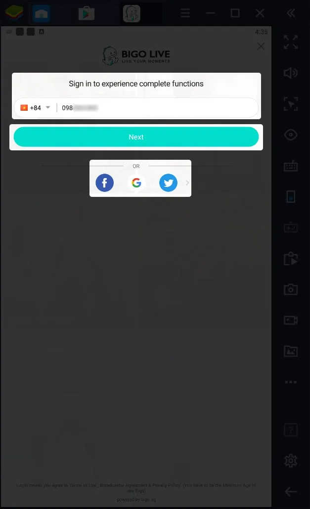 Sử dụng tài khoản hiện có của bạn để đăng nhập. Bigo Live hỗ trợ nhiều phương thức đăng nhập khác nhau. Bạn có thể sử dụng Facebook, Google, Twitter, hoặc số điện thoại đã đăng ký trước đó. Sau khi chọn phương thức và nhập thông tin, nhấn “Next” để hoàn tất.
