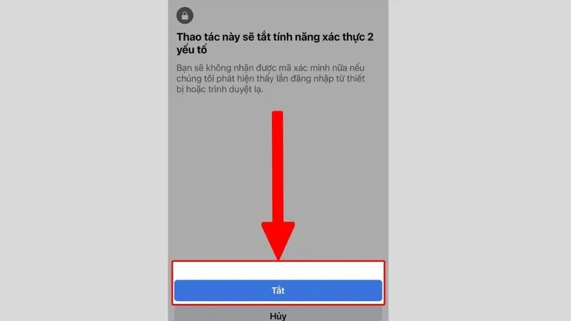Nhấn “Tắt” để xác nhận rằng bạn muốn hủy bỏ tính năng xác thực hai yếu tố này. Facebook sẽ gửi thông báo xác nhận rằng 2FA đã bị vô hiệu hóa thành công. Bạn nên kiểm tra email liên kết với tài khoản Facebook để đảm bảo không có bất kỳ thông báo bất thường nào khác.